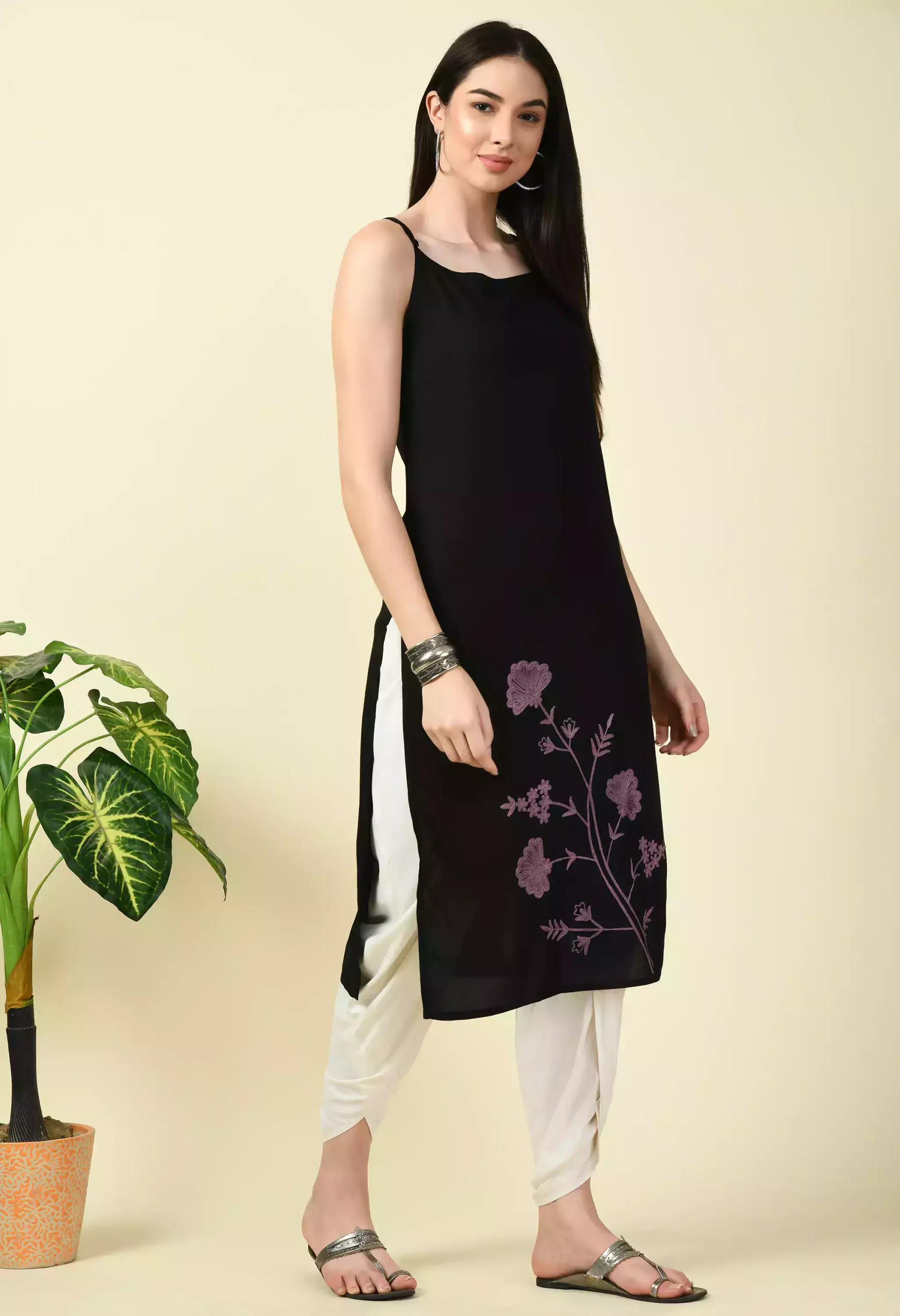 Black Pashmina Work Sleeveless Kurti