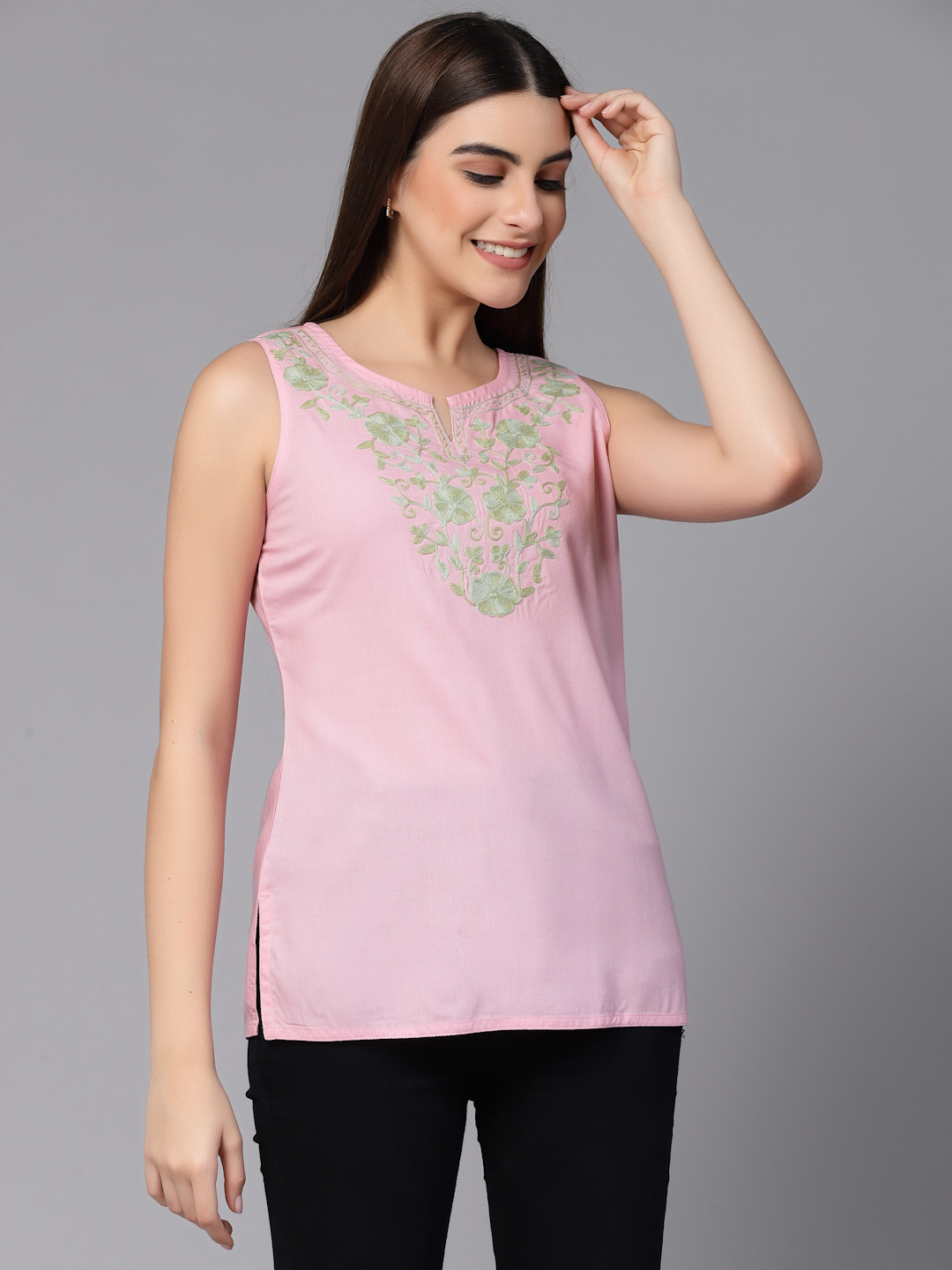 Home Short Kurtis Nadia Kashmiri Light Pink Sleeveless Kurti