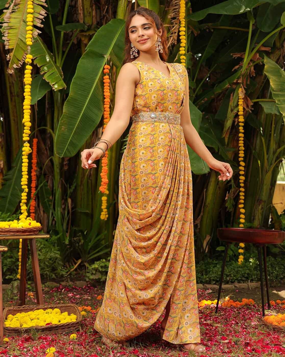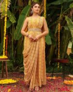 Gold Flake Pleated Saree with Stitched Blouse